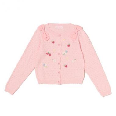 羽織るだけで、華やかなスタイルへと導くカーディガンです。飾りリボンやフラワー、苺のモチーフなど、女の子らしい可愛いポイントを多く盛り込みました。季節の変わり目に、ワードローブにあると重宝するアイテムです。