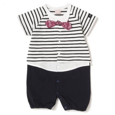 ボーダーシャツとボトムスのコーデ風カバーオールです。股下スナップの留め方を変えることで、2パターンのコーデを楽しめます。フロントのリボンを取り外せば、よりスタイリッシュな印象に♪ ズボンの後ろには小さなポケットつきです。