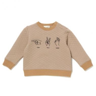 ふんわりソフトなキルト地を採用した、カジュアル感あふれるトレーナーです。ハンドモチーフのユニークな刺しゅう入りで、周りとちょっぴり差がつくアイテム♪ フチの部分はリブ素材で切り替え、メリハリあるルックスに。内側にお名前を記入できるタグつきです。※80、90サイズのみ肩開き