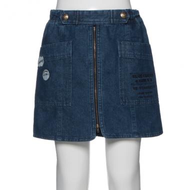 フロントジップで辛口なアクセントをプラスした台形スカパンです。ポップなワッペンやロゴ刺しゅうをデザインした、個性的なポケットが目を引くアイテム♪ ウエストはアジャスターゴムで程良いサイズ感に調節できます。