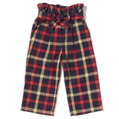 ふんわり起毛感のあるフランネルチェック生地で仕立てたパンツです。程良く幅を持たせたワイドシルエットで、上級者らしいバランスコーデを楽しめる1本♪ フリル&リボンベルトで飾ったウエストは、トップスの裾をインしてアピールするのがおすすめ。内側にお名前を記入できるタグつきです。・モデルサイズ108cm・着用サイズ110cm