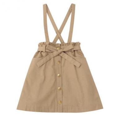 フロントに結んだボウや、ウエストにあしらったフリルがフェミニンな雰囲気を演出するサスペンダーつきスカートです。ゴールドカラーのボタンを配して、高級感の漂うアクセントに。サスペンダー・ボウは取り外しができます。ウエストはアジャスターゴムでサイズ調整可能。左右にポケットつきです。