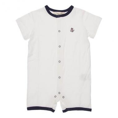 マリンテイストのデザインが魅力のボディスーツです。前開きタイプになっており、ボタンはすべてスナップ式なので着脱が楽ちん♪ 日差しによるダメージを軽減するUVカット加工済みなので、お出かけシーンにもお使いいただけます。
