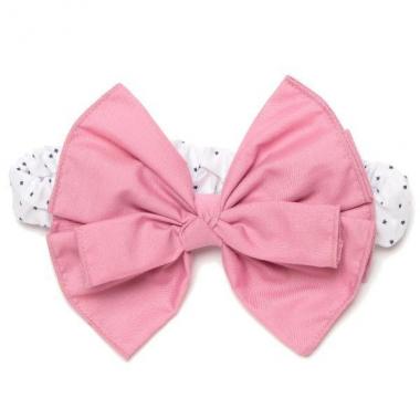 大きさの違う2つのリボンがドッキングしたようなキュートなヘアバンドです。カジュアルな素材感なので、インパクトあるリボンデザインでもデコラティブになりすぎません。ギャザーを寄せたバンド部分も、ディープピンクはスター柄、ブルーグレーはボーダー柄とカラーによって異なります。