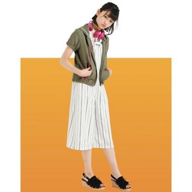 さわやかなストライプ柄のコンビネゾンとスタイリッシュなロゴTシャツのセットです。縦のラインを強調してスタイルよく見せてくれます。シンプルなTシャツは他のアイテムとの相性も抜群◎。キュートなチョーカーつきです。コンビネゾンは肩紐のボタン、ウエストのアジャスターゴムでほどよいサイズに調整できます。・モデルサイズ167cm・着用サイズ160cm