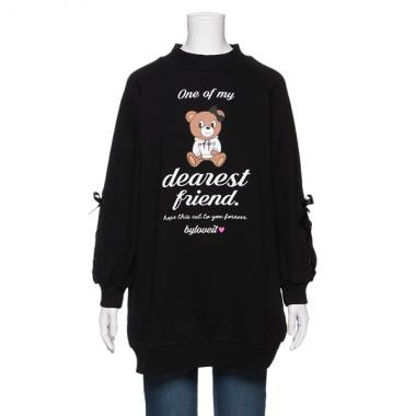 普段と違ったラビ子の服装がポイントの裏毛トレーナーです。ワンピースのようなロング丈はゆったりシルエットを演出。袖サイドにレースアップデザインをほどこし、女の子らしさをプラスしました。両側ポケットつきでデイリー使いにぴったりなアイテムです。