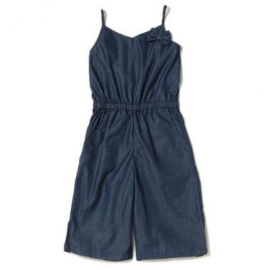 さわやかなダンガリー生地で仕立てたオールインワンです。胸元のリボンがガーリーなアクセント♪ ウエストゴム入りでフォルムに変化をプラスしました。インナーを選んだ着こなしを楽しめるのもうれしいところ。