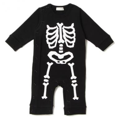 遊び心あふれるボーンデザインで、茶目っ気たっぷりに決まるカバーオールです。ソフトな裏毛生地を使用し、着心地の良さにもこだわったアイテム♪ 内側にお名前を記入できるタグつきです。仮装イベントなどにもぴったりな1着。
