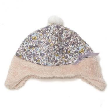 花柄生地とふわふわなボア素材をミックスした、やさしい雰囲気の帽子です。愛らしいポンポンやリボン飾りが女の子らしさを高めるアクセント♪ サイドを長めにデザインしており、耳までほっこりと包み込むアイテムです。