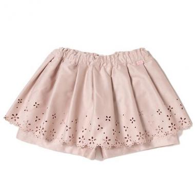 タック入りのふんわりとした表地へフラワー風のカットワークをほどこして、ガーリーに仕上げたキュロット。フェイクスエード生地を採用した、秋冬シーズンにぴったりのアイテムです♪ ※アジャスターゴムでウエスト調節可能