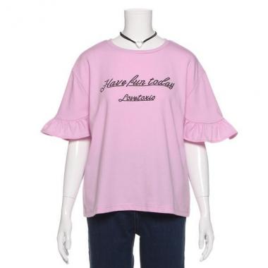 肩を落としたリラックス感あるシルエットのTシャツです。シンプルなデザインにロゴの刺しゅうやフリルの袖口がスイートなアクセントを加えています。乙女心をくすぐるパステルカラーをラインナップ。チョーカーと合わせれば、ちょっぴりクールムードに♪ ボーイッシュにもガーリーにも着こなせます。※ボトムスは参考商品です