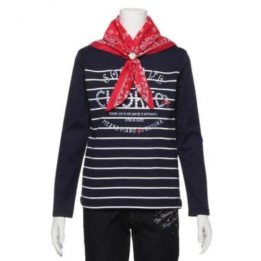 バンダナとゴムがセットになった長袖Tシャツです。バンダナはペイズリー柄、ゴムにはイカリのデザイン、Tシャツにはボーダーと、マリンテイストを想起させるデザインで統一されています♪ バンダナの付け方をアレンジしたり、ゴムをヘアゴムとして使ったり、コーディネートの幅を広げてくれる嬉しいセットアイテムです。
