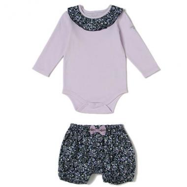 ちょっとおめかししたいシーンにぴったりなカバーオール×パンツのセットです。カバーオールにはネック周りを華やかに彩るフリルをほどこし、ラメの刺しゅうをアクセントにプラスしました。パンツは衿元とリンクした柄を採用し、まとまりのある仕上がりに。※カバーオールの肩ボタンは後ろ側についています