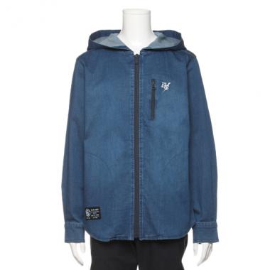 ジップアップ×フードつきデザインで、パーカー風に仕上げたシャツです。胸元の刺しゅうや裾のロゴパッチがブランドをクールに印象づけるアイテム。軽い羽織りとして季節の変わり目にも重宝します。両側ポケットつきです。※ボトムスは参考商品です