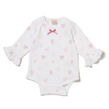 胸元へツヤやかなリボンをあしらい、上品な甘さを効かせたロンパースです。袖口をフリルで飾った、華やかなディテールがポイント♪ オフホワイトはウサギ柄、アイボリー・ピンクは無地と、カラーによって異なるパターンを採用しました。