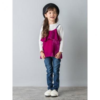 オシャレなレイヤードスタイルが完成するセットです。凸凹とした生地のカットソーはシンプルにデザインして合わせやすく。上品な光沢のあるキャミソールにはフリルをあしらってガーリーに。単品使いも可能なワードローブの幅が広がるアイテムです! ・モデルサイズ116cm・着用サイズ120cm