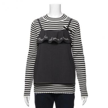 胸元をロゴ入りフリルで飾ったフェミニンなキャミソールと、ボーダー柄のカジュアル感あふれるニットのセットです。女の子らしいレイヤードコーデを手軽に楽しめるアイテム♪ リボンモチーフはブローチ式となっているので、取り外して手持ちの洋服にアレンジしても◎。※ボトムスは参考商品です