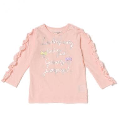 ショルダーラインのフリルがチャーミングなTシャツです。なめらかに描かれたキラめくロゴが上品な雰囲気をプラス♪ 薄手の生地なのでアウターを羽織ってももたつかず、シーズンを選ばず着用できるのもポイントです。※80、90サイズのみ肩開き
