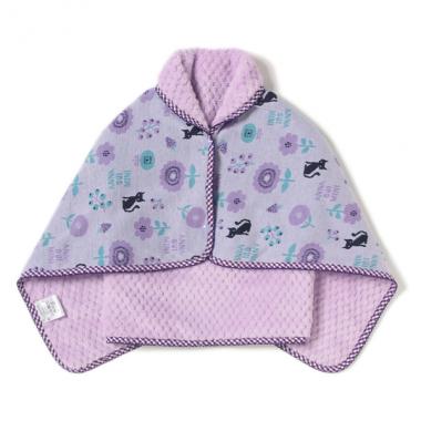 お花やブランドアイコンをにぎやかにデザインしたブランケットです。長い丈の片側に4つのスナップボタンをつけており、ケープのようにしっかりと身体を包み込める優れもの。肌への接地面にはふわふわとしたボアを使用しています。