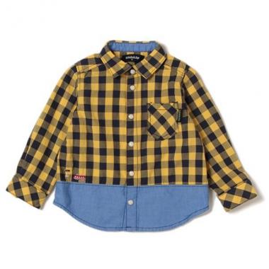 ユニークな切り替えデザインで、個性あるスタイルを叶えるシャツです。前後に刺しゅうした電車モチーフが目を引くアクセント♪ カラシとグリーンはチェック柄、サックスは無地と、カラーによって異なるパターンを採用しました。・モデルサイズ89cm・着用サイズ90cm
