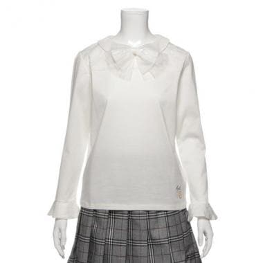 ヨークや袖口にレースを合わせた、フェミニンかつ華やかなTシャツブラウスです。衿つきの上品なデザインで、卒服としても活躍するアイテム♪ 大ぶりで存在感のあるリボンブローチは、お好みで取り外せる仕様です。※ボトムスは参考商品です