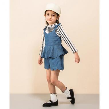 肩リボンつきの女の子らしいぺプラムビスチェと、シンプルで着回しやすいリブTシャツのセットです。ブルーは無地ビスチェにボーダー柄Tシャツ、黒はドット柄ビスチェに無地Tシャツを組み合わせています。※80、90サイズのみ肩開き・モデルサイズ116cm・着用サイズ120cm