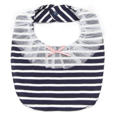 お顔まわりを華やかに彩るスタイです。チュールや細めのグログランリボンでキュートなエッセンスをプラス♪ 紺・トップグレーはボーダー柄、ライトピンクは無地とカラーによってパターンが異なります。首周りはスナップボタンで着脱も簡単です。