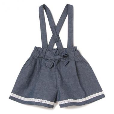 ウエストにリボン、裾へレーステープをあしらい、女の子らしく仕上げたショートパンツです。サスペンダーは取り外せる仕様で、コーデに合わせて変化を楽しめるのが◎。カジュアルな素材感で、デイリーに気兼ねなく使えます。