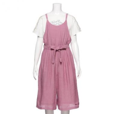薄手で軽やかな素材のオールインワンと、袖にレースアップをデザインしたTシャツのセットです。オールインワンのベルトは取り外しができますので、スタイルに変化を付けて楽しんで♪ Tシャツは、袖に大きくレースアップを配し、シンプルながらディテールにこだわりました。オールインワンの両側にポケット付。
