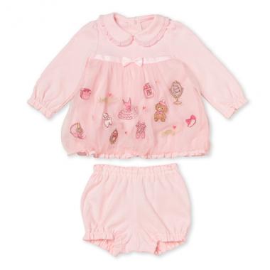 乙女心にヒットするモチーフを刺しゅうで仕上げた、こだわりあふれるTシャツとブルマのセットです。ピンドット柄と相まってこれだけでお上品なスタイルが完成します。Tシャツの裾には軽くゴムを入れており、ボリュームのあるシルエットを演出することも♪ スナップボタン仕様でお着替えもスムーズに行えます。