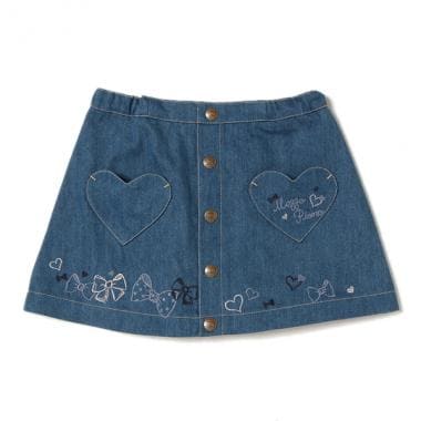 すっきりとした台形シルエットのスカートです。ハート型のポケットやリボンなどの刺しゅうを加えてガーリームードを高めた仕上がりに♪ バックにあしらったフリルも見逃せないポイントです。ウエストはアジャスターゴムで程よいサイズに調整できます。