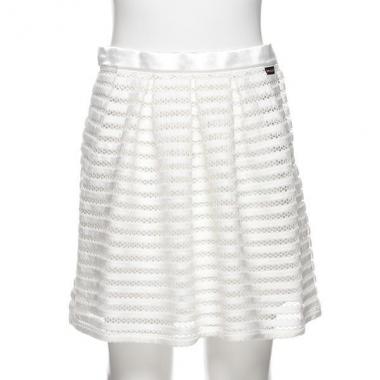 ボーダー柄のレースを用いた、軽やかなスカートです。タックからやわらかに広がるシルエットがフェミニン♪ ウエストは光沢のある生地で切り替え、華やかな仕上がりに。短すぎず、長すぎずの程良いレングスで使いやすいアイテムです。※アジャスターゴムでウエスト調節可能