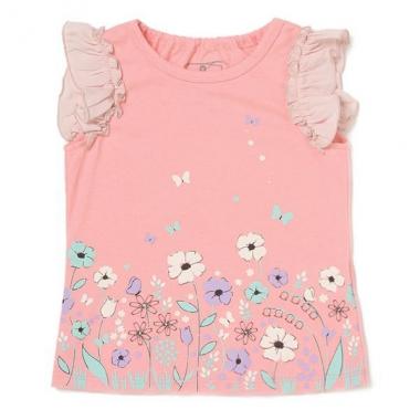 お花とちょうちょをカラフルに描いた愛らしいデザインのノースリーブです。袖にフリルを添えて、ガーリーな雰囲気に♪ シンプルなクルーネックで顔周りをすっきりと見せてくれます。パンツ・スカートどちらとも相性がよく、様々なコーデを楽しめるアイテムです。