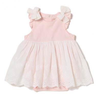 レース切り替えでスイートに仕上げたロンパースです。揺れるスカートと肩に添えたリボンが愛らしい印象を与えます。背中と股下はスナップボタンで開閉が可能。オフホワイトはドット、モデレートピンクは無地、黒はボーダーと、カラーによってパターンが異なります。