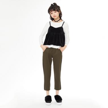 エレガントな光沢感のあるベロアキャミソールをドッキングしたTシャツのセットです。キャミソールの切り替えから流れるフレアがフェミニンな印象。控えめに入ったラメがアクセントになっています。着こなしをちょっぴり大人ムードにしてくれる素材感にも注目です。※ボトムは参考商品です