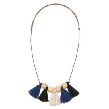 配色のタッセルを並べた個性の光るネックレスです。カッティングをほどこしたウッディーなパーツをミックスして表情豊かにデザイン♪ シンプルコーデのアクセント使いにオススメのアイテムです。コードをスライドさせれば長さの調整が可能。