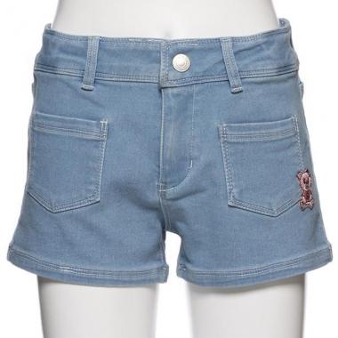 スッキリとしたコンパクトなシルエットで、女の子らしくはきこなせるデニムショートパンツです。フロントへアウトポケットを配した、レトロ調のディテールがポイント♪ ポップで愛らしいクマさんのワッペンも目を引く良いアクセントに。※アジャスターゴムでウエスト調節可能