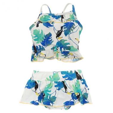 絶妙なカラーリングで仕上げた可愛らしいセパレートタイプの水着です。たっぷりとフリルをあしらい女の子ムード満点に仕上げました。紫外線をカットする素材を使用しているので、日差しが強い時期の水遊びにぴったりです♪
