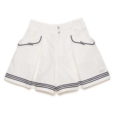フラップや裾に配色ラインを効かせて、マリン風にデザインしたプリーツキュロットです。小ぶりの愛らしいリボン飾りが乙女心をくすぐるポイント♪ ウエストにはイカリマーク入りのボタンを採用し、細部まで雰囲気のある仕上がりに。※アジャスターゴムでウエスト調節可能