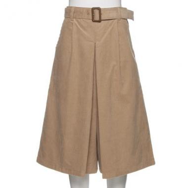シーズンムードを盛り上げるガウチョパンツです。共布のベルトがアクセント。バックポケットにはロゴ刺しゅうを添えました。モカ茶とモデレートブルーはコーデュロイ、紺はデニム素材と大人っぽいコーディネートにマッチするシンプルな1本です! アジャスターゴムでウエスト調節可能。 モカ茶とモデレートブルーは裏地付き。両側ポケット付きです。※モカチャと紺はキッズサイズあり、品番:4874114。