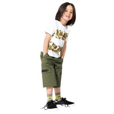 太ボーダー柄の存在感あふれるTシャツです。ブランドアイコンでおなじみのゴリラをミックスした、オリジナルのカモフラージュ模様がポイント。個性あるデザインで周りと差がつきます。内側にお名前を記入できるタグつきです。※80、90サイズのみ肩開き・モデルサイズ108cm・着用サイズ110cm