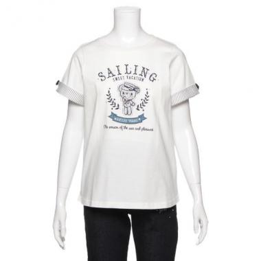 目立つフロントにコロンちゃんのステッチを入れたTシャツです。セーラー服やマリンハットを身にまとったコロンちゃんがとびきりキュート♪ 袖口は折り返すとストライプがのぞき、リボンでひきしめアクセント。さわやかスタイリングに重宝する一枚です。※ボトムは参考商品です