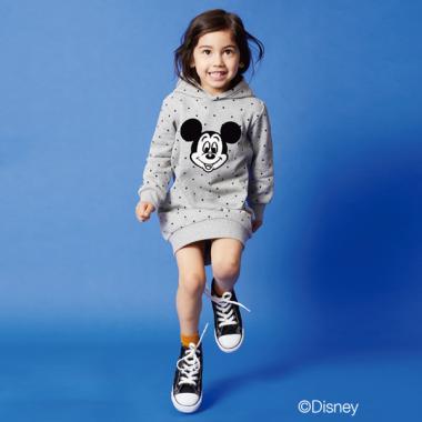 フロントのミッキーマウスが印象的なドット柄パーカーワンピース。カジュアルな雰囲気で着こなせるアイテムです。フードにはロゴをデザインし、後ろ姿までオシャレに仕上げました。裏毛素材&袖口と裾のリブ使いで、着心地も快適。内側にはお名前を記入できるタグがついています。