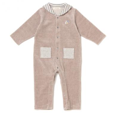 ちょっぴり渋めの風合いがこなれた雰囲気のカバーオールです。セーラーのような衿ぐりがなんともさわやか♪ ポケットにはワッフル地、ボディにはベロア地を採用し、ニュアンスに変化をつけました。お子さまにやさしいオーガニックコットン素材のアイテムです。