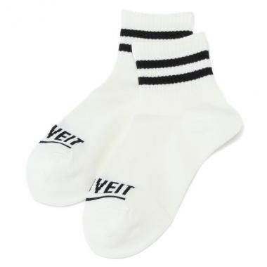 リブ編みで引きしめたはき口へ配色ラインを効かせて、スポーティーな雰囲気に仕上げたソックスです。アッパーのロゴデザインもおしゃれ心をくすぐるポイント♪ スッキリとしたショート丈は、長めのボトムスともバランスを取りやすいアイテムです。