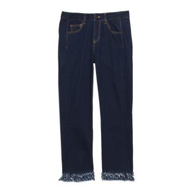 リメイクデザインの個性派デニムパンツです。フサフサとしたフリンジ状の裾が目を引く良いアクセント♪ 燻したようなウエストボタンは表情に深みをプラス。コーディネートのポイントとして存在感を放ちます。ストレッチ入りの生地を採用しているのもうれしい。