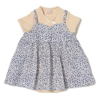 小花柄ワンピースとリブ仕様のリボンつきロンパースのセットです。赤ちゃんに直接触れるロンパースはリブにして着心地を考えました。フロントにはサテンリボンをつけてちょっぴりおめかし♪ ワンピースは小花柄を控えめに描いた主張しすぎないデザインです。肩ひもはボタンで外れるので着脱が簡単なのもポイントです。