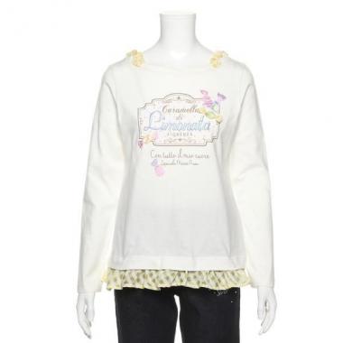 要所でギンガムチェックをリンクさせた、凝ったディテールのクルーネックTシャツです。思わず手が伸びてしまいそうなおいしそうなキャンディをフロントモチーフに採用。全体を女の子らしいやわらかなカラートーンでまとめました。裾のフリルは取り外せます。※ボトムは参考商品です