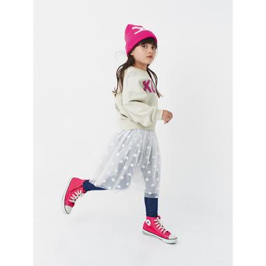 それぞれ単品使いもできてユースフルなロゴレギンスです。ドット柄のチュールスカートはエアリーでとてもキュート♪ オフホワイトはデニム地、黒は一般的なレギンス地とカラーで素材が異なります。ウエストロゴをアピールするタックインスタイルがおすすめ。内側にはお名前を記入できるタグつきです。
